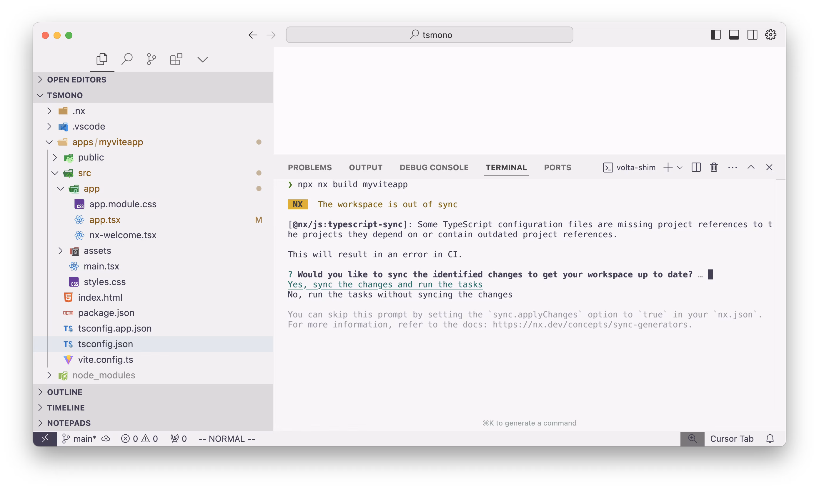 To address this, Nx introduces the nx sync command, which automatically keeps your TypeScript project references in sync. Whenever you run commands like build, serve, or dev, Nx verifies whether the project references are accurate. If they are out of sync, it prompts you to update them.